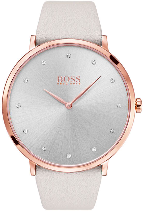 Hugo Boss 1502412 Jillian -kellon kellotauluun on istutettu säikyviä kiviä indekseiksi. Lunnonvalkoinen nahkaranneke istuu kauniisti kellon punakullan väriseen runkoon. Kellon rungon leveys on 40mm ja rannekkeen kiinnityskohdan leveys 20 mm. Rungon paksuus 7mm. Hugo Boss kelloille myönnetään 2 vuoden takuu ja ne toimitetaan valmistajan alkuperäisessä rasiassa postikuluitta!