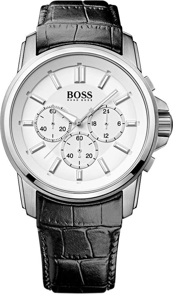 Tyylikäs miesten Hugo Boss HB1513033 rannekello mustalla nahkarannekkeella ja valkoisella kellotaululla. Kellon rungon leveys on 44mm ja rannekkeen leveys 24mm. Kellossa on ajanotto ja päivyri. Hugo Boss kelloille myönnetään kahden vuoden takuu. Toimitetaan valmistajan alkuperäisessä rasiassa postikuluitta!