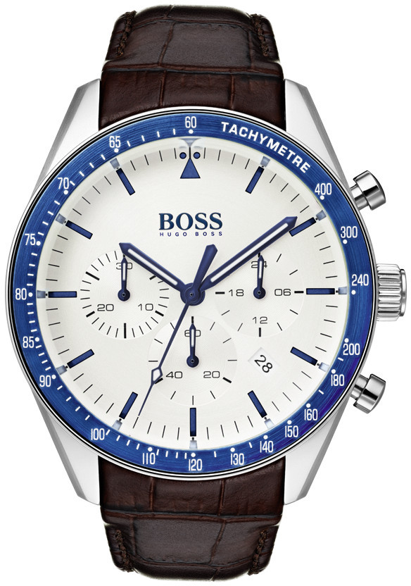 Hugo Boss Trophy 1513629 -rannekello erottelee miehet pojista. Tässä tummanruskeassa mallissa on ruostumattomasta teräksestä valmistettu 44 mm runko sekä nahkaranneke (22 mm kiinnityskohdasta). Kellon kehää kiertävällä sinisellä takometrillä voit mitata nopeutta ja kuljettua matkaa, sekuntikellolla taas aikaa. Luminoituvat viisarit näkyvät hyvin pimeässä. Usein vaatimattomuus kaunistaa, mutta Hugo Boss Trophy kädessä kumarteluun harvoin on aihetta.