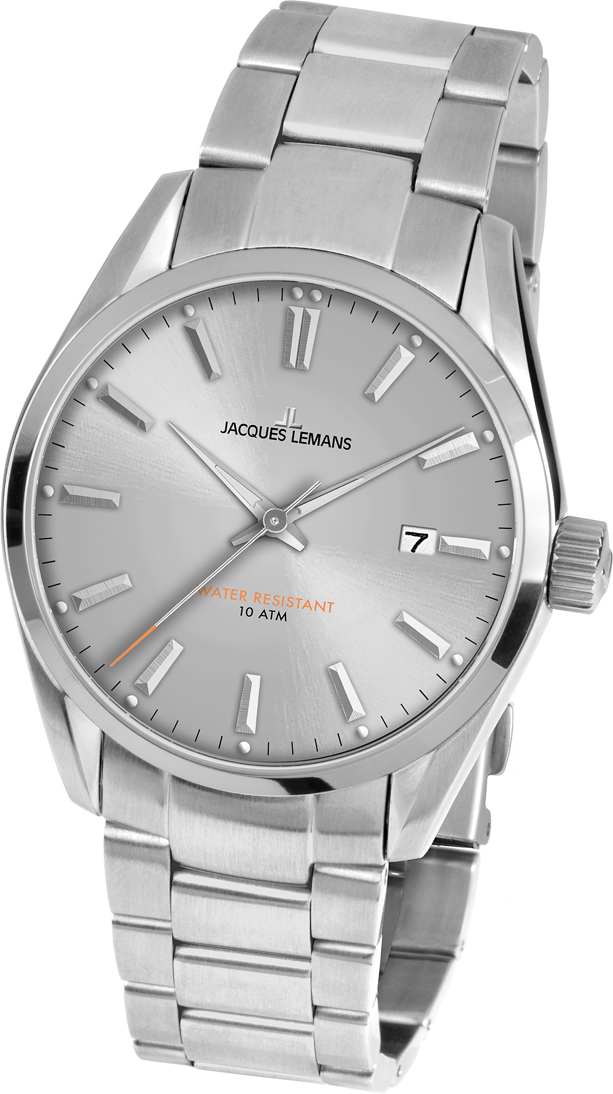 Täysin ruostumattomattomasta teräksestä valmistetun Jacques Lemans Derby 1-1859F kellon 40 mm:n levyisessä yksinkertaisessa vaaleanharmaassa näytössä on metallinväriset luminoidut osoittimet ja päivyri. Sekuntiviisarissa on oranssi yksityiskohta. Kellotaulua suojaa crystex-mineraalilasi, ja kello on vesitiivis 100 metriin saakka. Jacques Lemans kelloille myönnetään 2 vuoden takuu, ja ne toimitetaan valmistajan alkuperäisessä rasiassa.