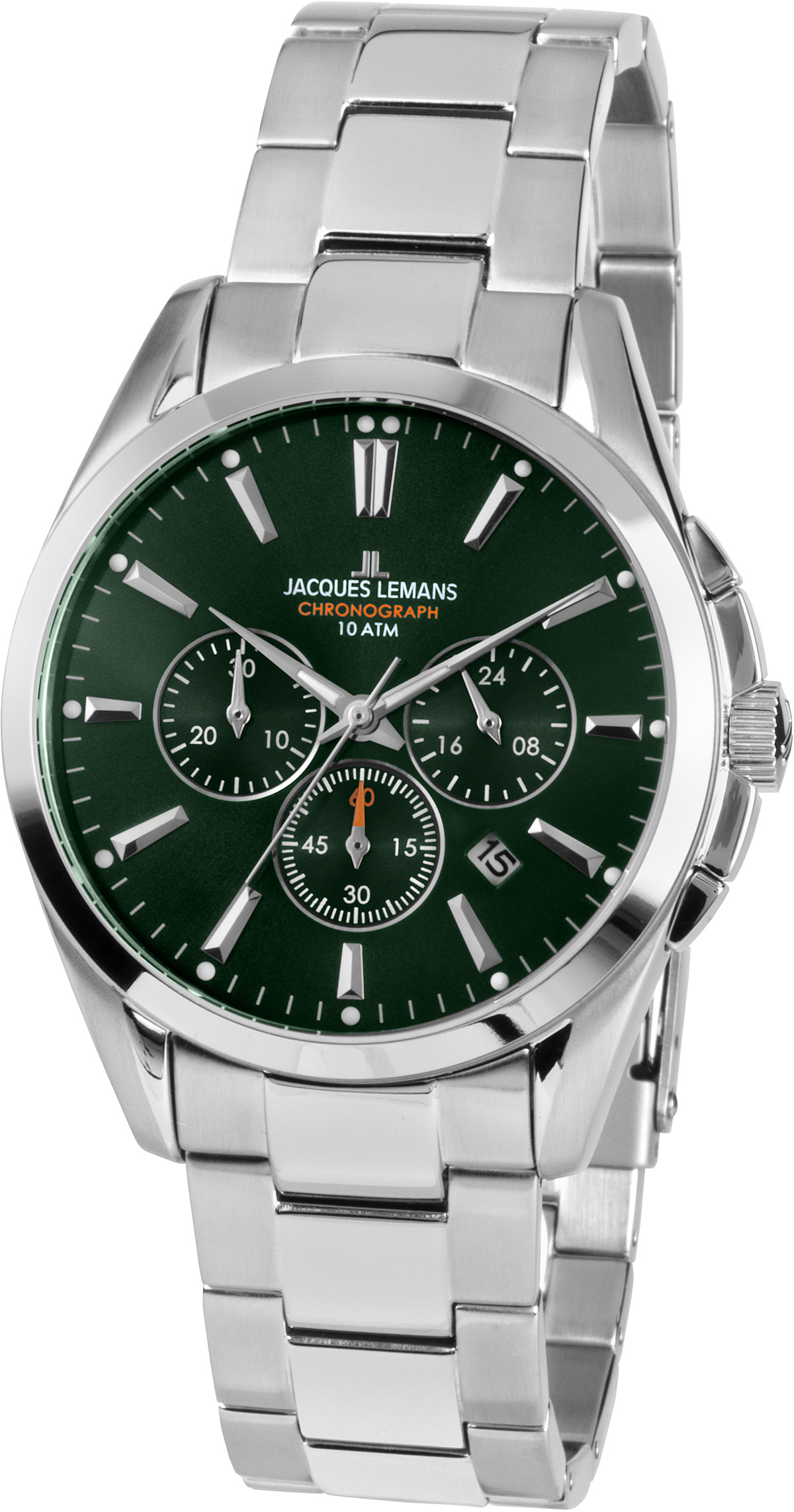 Täysin ruostumattomattomasta teräksestä valmistettu Jacques Lemans Derby Chronograph 1-1945F on tyylikäs ja monipuolinen ajannäyttäjä. Yksinkertaisessa metsänvihreässä näytössä on metallinväriset luminoidut osoittimet, 24 tunnin kello, minuutti- ja sekunttinäytöt, ajanotto ja päivyri. Kellossa on crystex-mineraalilasi ja rungon leveys on 42 mm. Kello on vesitiivis 100 metriin saakka. Jacques Lemans-kelloille myönnetään 2 vuoden takuu, ja ne toimitetaan valmistajan alkuperäisessä rasiassa.