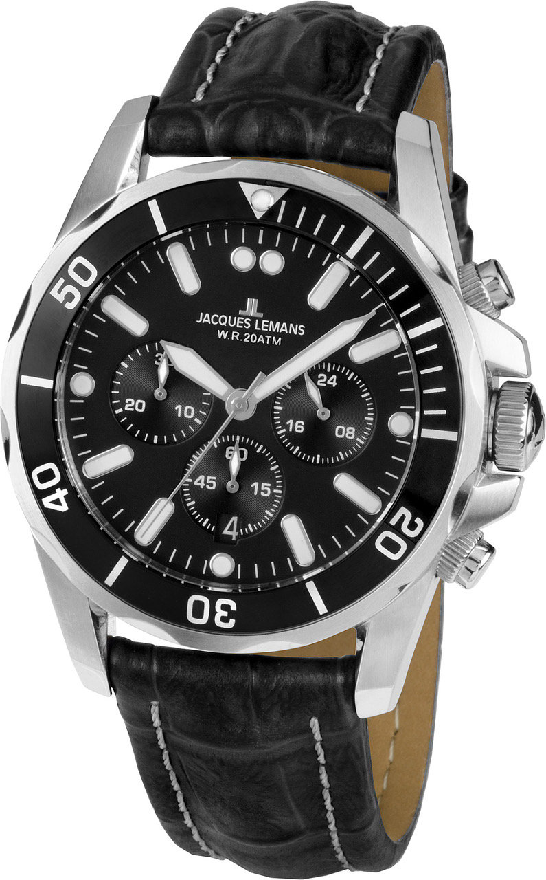 Jacques Lemans Liverpool Chronograph 1-1907ZA-kello vastaa koviinkin urheilullisiin haasteisiin. 43 mm:n levyinen runko on valmistettu ruostumattomattomasta teräksestä, ja vahva musta kellotaulu ja paksut luminoidut osoittimet näyttävät selkeästi aikaa. Kellon ominaisuuksiin kuuluu 24-tunnin näyttö, ja minuutti- ja sekuntikello ja päivyri, kellokehä (bezel) ja se on vesitiivis 200 metriin saakka. Ranneke on tikattua mustaa nahkaa. Kellotaulua suojaa kestävä crystex-mineraalilasi. Jacques Lemans kelloille myönnetään 2 vuoden takuu, ja ne toimitetaan valmistajan alkuperäisessä rasiassa.