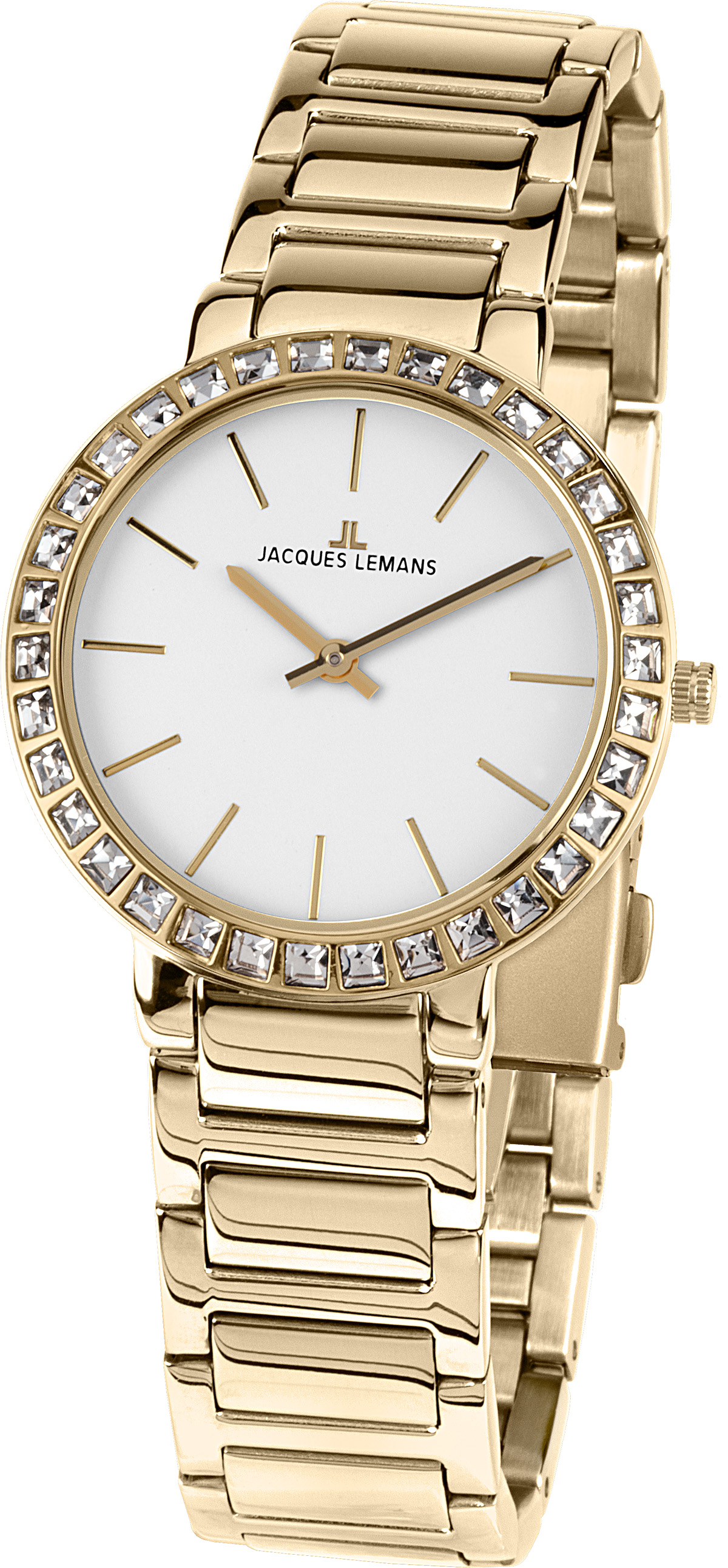 Jacques Lemans Milano 1-1843.1E-kellon eleganttia 32 mm:n valkoista kellotaulua somistaa trendikkäät kullansävyiset osoittimet, ja näyttävyyttä kelloon tuo taulua kehystävät 34 aitoa Swarowski-kristallia. Kullansävyinen ranneke on valmistettu ruostumattomattomasta teräksestä. Jacques Lemans-kelloilla on 2 vuoden takuu, ja ne toimitetaan valmistajan alkuperäisessä rasiassa.