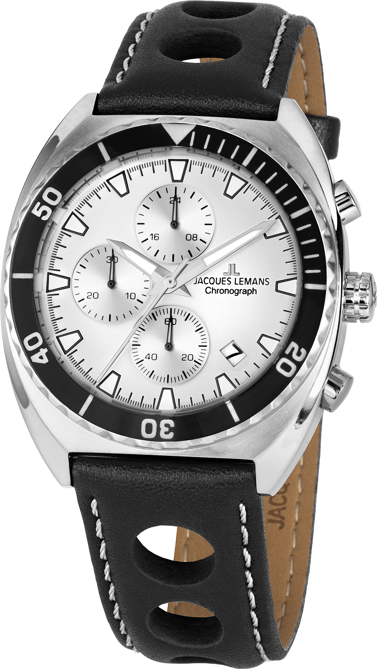 Jacques Lemans Retro Chronograph 200 1-2041B-kellon muotoilu kiinnittää huomion. Näyttävä hopeanvärinen 41 mm:iä leveä runko on valmistettu ruostumattomasta teräksestä, ja runkoa ympäröi sininen kellokehä. Musta rei'itetty nahkaranneke on saanut inspiraationsa ajohanskoista. Hopeanvärinen kellotaulu ja luminoidut osoittimet ja viivaindeksit, yhdessä minuutti- ja sekuntikellonäyttöjen kanssa viimeistelevät virtaviivaisen kokonaisuuden. Kellotaulussa on myös 24 tunnin kello ja päivyri. Kellotaulua suojaa kestävä crystex-mineraalilasi, ja kello on vesitiivis 100m saakka. Jacques Lemans-kelloilla on 2 vuoden takuu, ja ne toimitetaan valmistajan alkuperäisessä rasiassa.