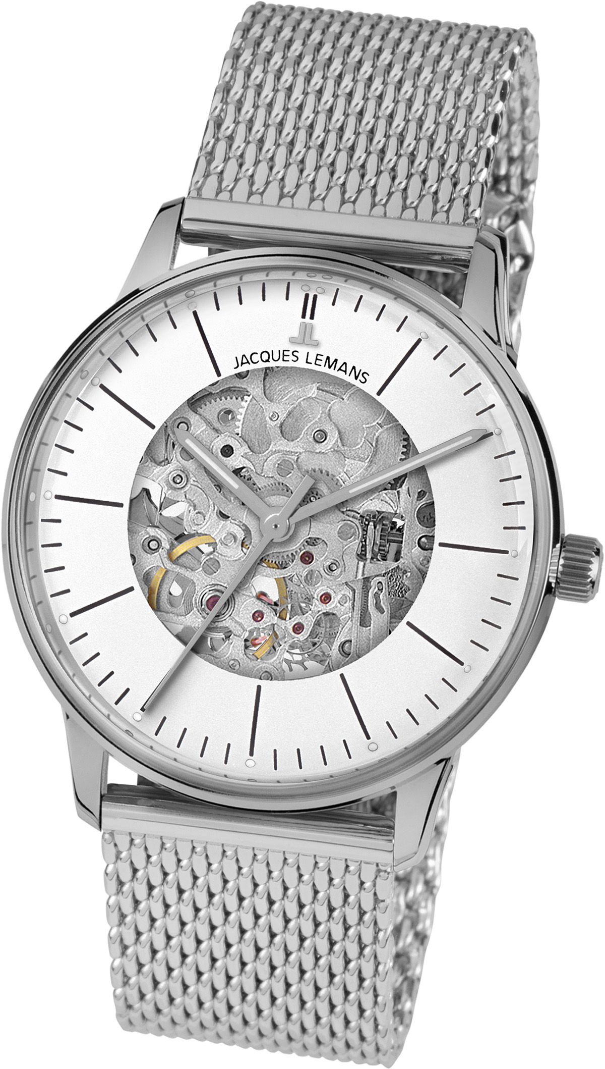 Käsinviritettävä Jacques Lemans Retro Classic N-207ZC on ainutlaatuisesti muotoiltu. Luurankokellon mekaaninen koneisto näkyy osittain kellotaulussa ja kellon takakansi on täysin läpinäkyvä. Koneistoa kehystää valkoinen ulkokehä, jossa on indeksimerkinnät, ja kellon metalliväriset viisarit on luminoitu. Kellossa on punottu teräksinen mesh-ranneke, 38mm:n runko ja akryylilasi. Jacques Lemans-kelloilla on 2 vuoden takuu, ja ne toimitetaan valmistajan alkuperäisessä rasiassa.