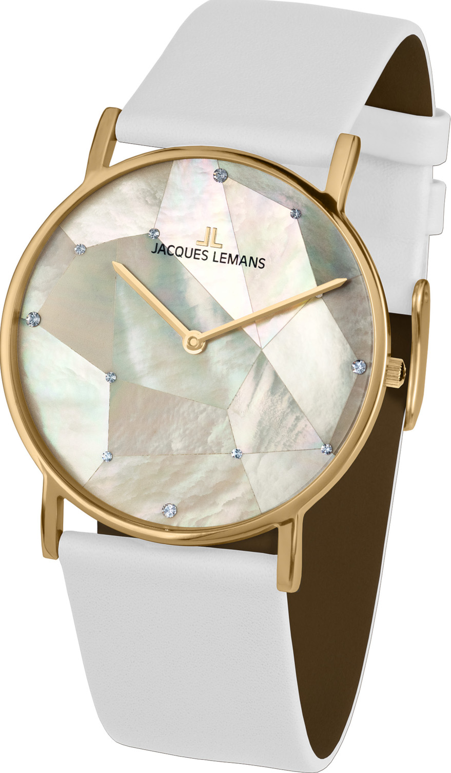 Jacques Lemans York 1-2050I-kello on ainulaatuinen, moderni ja yksilöllinen. Kellossa on maltillisesti muotoiltu teräksinen, kullanvärinen, pyöreä runko, joka luo täydellisen kehyksen kellotaulussa risteilevälle 14 osan helmiäismosaiikille, jota korostavat useat kauniit, aidot Swarowskin kristallit. Osoittimet ovat kullanväristä terästä, ja ranneke on miellyttävän pehmeää valkoista nahkaa. Kellotaulua suojaa crystex-mineraalilasi. Jacques Lemans-kelloilla on 2 vuoden takuu, ja ne toimitetaan valmistajan alkuperäisessä rasiassa.