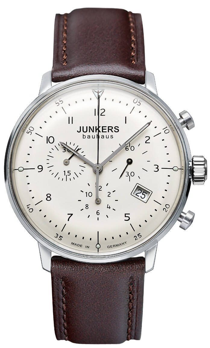Junkers Bauhaus Chronograph 6086-5 -rannekello on tyylikäs ja retro! Kellon runko on valmistettu hopean värisestä ruostumattomasta teräksestä ja tummanruskea ranneke on aitoa nahkaa. Lisäksi kellon viisarit hohtavat pimeässä! Junkers -kellot ovat valmistettu Saksassa, saksalaisella työllä sekä vähintään 50% käytetyistä materiaaleista ja osista on valmistettu Saksassa! Ominaisuuksina kellosta löytyy myös päivyri, ajanotto 30 minuuttiin saakka sekä erillinen sekuntiosoitin. Kellossa on laadukas sveitsiläinen Ronda 5030.D -paristokoneisto. Kellon rungon leveys on 40mm ja paksuus 10mm. Kellon paino on 53g. Junkers -kelloille myönnetään 2 vuoden takuu ja ne toimitetaan valmistajan alkuperäisessä rasiassa.