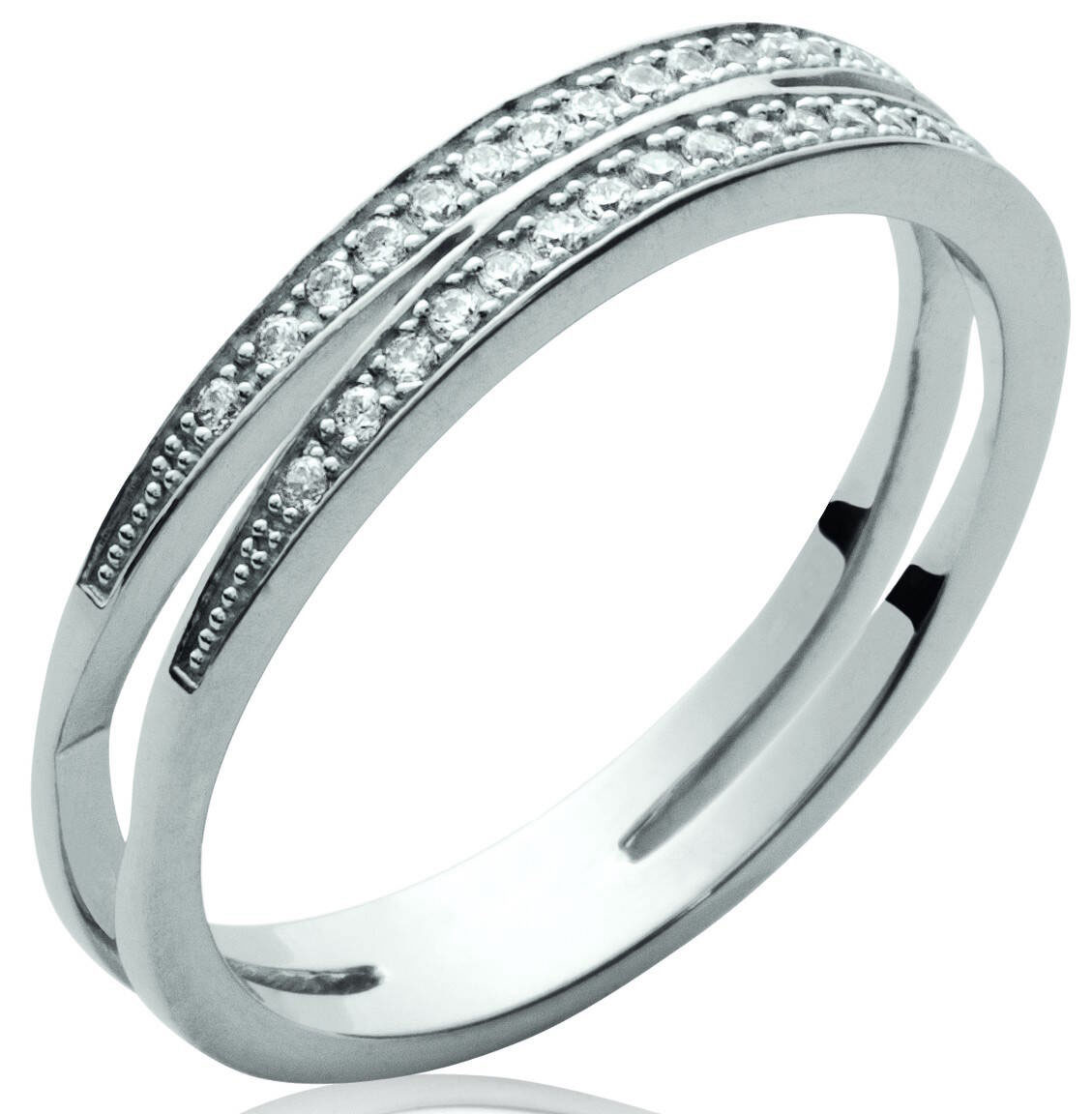 Kaksirivinen hopeasormus 1248410 on valmistettu 925 Sterling hopeasta ja siinä on kahdessa rivissä useita kirkkaita zirconia korukiviä. Sormuksen rungon leveys on 4mm.