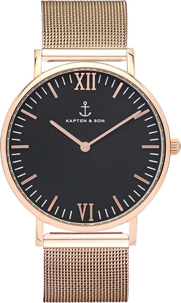 Kapten & Son Campus Black Mesh kellossa on punakullan värinen runko, musta kellotaulu ja punakullan värinen ruostumattomasta teräksestä valmistettu mesh-ranneke. Kellotaulua koristaa Kapten & Son kellomerkin ankkurilogo ja indeksit kuusi ja kaksitoista on esitetty roomalaisin numeroin. Kellossa on laadukas Sveitsiläine Ronda 762 paristokoneisto. Rungon leveys on 40 mm ja paksuus vain 7 mm. Rannekkeen leveys kiinnityskohdasta on 20 mm. Kapten & Son kelloille myönnetään kahden vuoden takuu ja ne toimitetaan valmistajan alkuperäisessä rasiassa.
