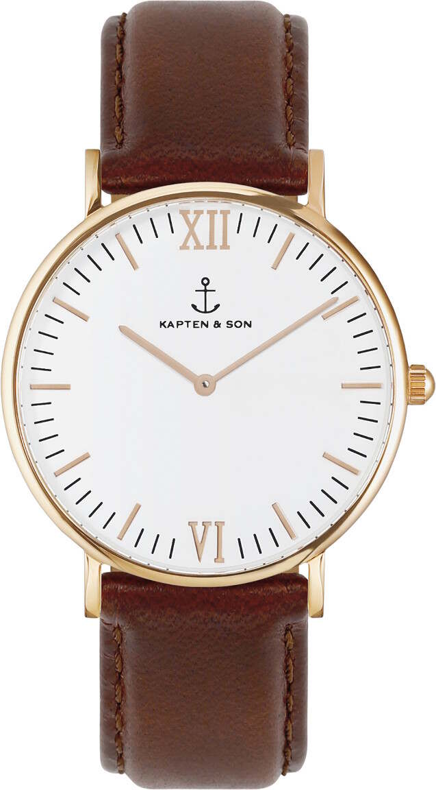 Kapten & Son Campus Brown Leather kellossa on punakullan värinen runko, valkoinen kellotaulu ja ruskea nahkaranne. Kellotaulua koristaa Kapten & Son kellomerkin ankkurilogo ja indeksit kuusi ja kaksitoista on esitetty roomalaisin numeroin. Kellossa on laadukas Sveitsiläine Ronda 762 paristokoneisto. Rungon leveys on 40 mm ja paksuus vain 7 mm. Rannekkeen leveys kiinnityskohdasta on 20 mm. Kapten & Son kelloille myönnetään kahden vuoden takuu ja ne toimitetaan valmistajan alkuperäisessä rasiassa.