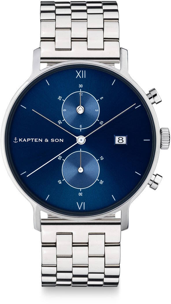 Puhtaan yksinkertaiset linjat ja sulava muotoilu ovat Kapten & Son Heritage -malliston tunnuspiirteitä. Kellot edustavat saksalaista Bauhaus-tyyliä, joka on toiminut modernin suunnittelun innoittajana jo 1900-luvun alkupuolelta saakka. Tämä sinisella kellotaululla ja hopeanvärisellä teräsrannekkeella varustettu Chrono Silver Blue Steel -malli on todellinen katseiden kääntäjä. Kellossa on lähes naarmuuntumaton safiirilasi ja sveitsiläinen Ronda 3520.D -koneisto, joten hinta-laatusuhteeltaan Kapten & Son Heritage todellakin näyttää hauista kilpailijoilleen. Rungon leveys 40mm ja paksuus 11mm. Rannekkeen leveys kiinnityskohdasta 20 mm. Ominaisuuksina ajanotto sekä päivyri. Tutustu myös sarjan muihin tyylikkäisiin edustajiin!