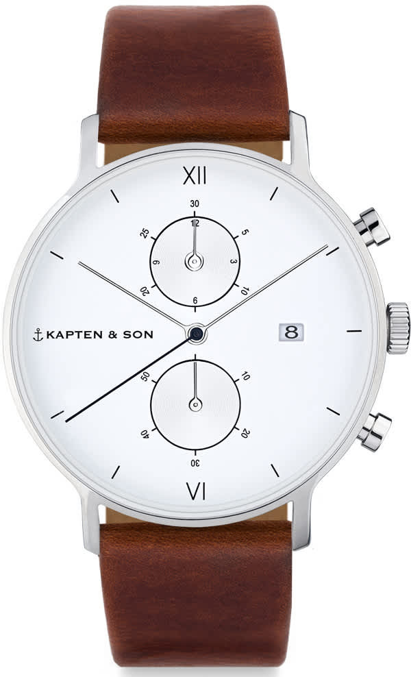 Puhtaan yksinkertaiset linjat ja sulava muotoilu ovat Kapten & Son Heritage -malliston tunnuspiirteitä. Kellot edustavat saksalaista Bauhaus-tyyliä, joka on toiminut modernin suunnittelun innoittajana jo 1900-luvun alkupuolelta saakka. Tämä norsunluunvalkoisella kellotaululla ja ruskealla nahkarannekkeella varustettu Chrono Silver Brown Leather Chrono -malli on todellinen katseiden kääntäjä. Kellossa on lähes naarmuuntumaton safiirilasi ja sveitsiläinen Ronda 3520.D -koneisto, joten hinta-laatusuhteeltaan Kapten & Son Heritage todellakin näyttää hauista kilpailijoilleen. Rungon leveys 40mm ja paksuus 11mm. Rannekkeen leveys kiinnityskohdasta 20 mm. Ominaisuuksina ajanotto sekä päivyri. Tutustu myös sarjan muihin tyylikkäisiin edustajiin!