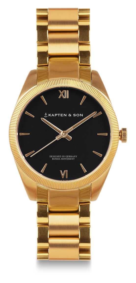 Kapten & Son Crush Gold Black Steel -rannekello on elegantti ja klassinen unisex rannekello. Rungon leveys on 36 mm ja rannekkeen kiinnityskohdan leveys on 18 mm. Sekä runko että ranneke ovat kullanvärisiä ja valmistettu 316L ruostumattomasta teräksestä. Tyylikkään ulkonäön kruunaa musta kellotaulu, jota koristaa Kapten & Son -kellomerkin ankkurilogo ja indeksit kuusi ja kaksitoista on esitetty roomalaisin numeroin. Kellossa on laadukas Sveitsiläisen Rondan paristokoneisto.