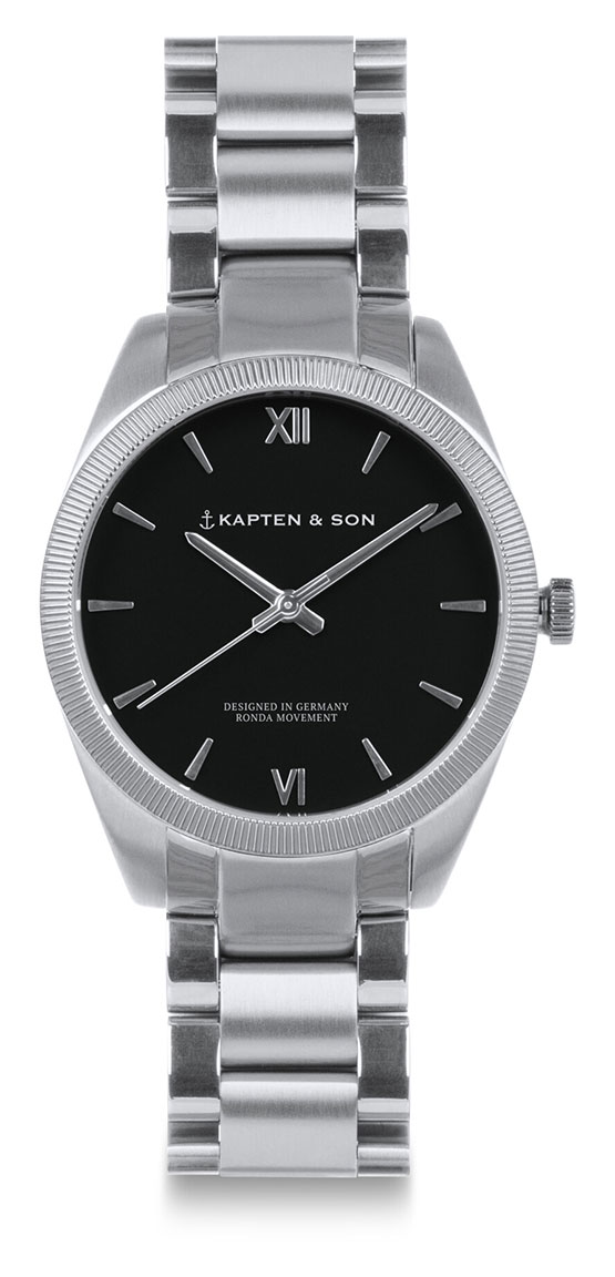 Kapten & Son Crush Silver Black Steel -rannekello on elegantti ja klassinen unisex rannekello. Rungon leveys on 36 mm ja rannekkeen kiinnityskohdan leveys on 18 mm. Sekä runko että ranneke ovat hopeanvärisiä ja valmistettu 316L ruostumattomasta teräksestä. Tyylikkään ulkonäön kruunaa musta kellotaulu, jota koristaa Kapten & Son -kellomerkin ankkurilogo ja indeksit kuusi ja kaksitoista on esitetty roomalaisin numeroin. Kellossa on laadukas Sveitsiläisen Rondan paristokoneisto.