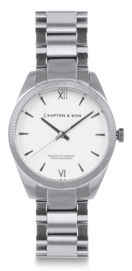 Kapten & Son Crush Silver Steel -rannekello on elegantti ja klassinen unisex rannekello. Rungon leveys on 36 mm ja rannekkeen kiinnityskohdan leveys on 18 mm. Sekä runko että ranneke ovat hopeanvärisiä ja valmistettu 316L ruostumattomasta teräksestä. Tyylikkään ulkonäön kruunaa valkoinen kellotaulu, jota koristaa Kapten & Son -kellomerkin ankkurilogo ja indeksit kuusi ja kaksitoista on esitetty roomalaisin numeroin. Kellossa on laadukas Sveitsiläisen Rondan paristokoneisto.