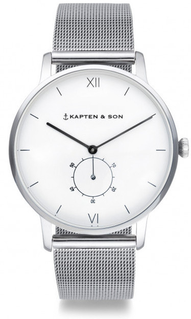 Puhtaan yksinkertaiset linjat ja sulava muotoilu ovat Kapten & Son Heritage -malliston tunnuspiirteitä. Kellot edustavat saksalaista Bauhaus-tyyliä, joka on toiminut modernin suunnittelun innoittajana jo 1900-luvun alkupuolelta saakka. Tämä valkoisella kellotaululla ja 20 mm filigraaniteräsrannekkeella varustettu Silver Mesh -malli on klassinen asuste juhlavaan pukeutumiseen. Kellossa on erittäin kova K1 mineraalilasi ja sveitsiläinen Ronda 1069 -koneisto, joten hinta-laatusuhteeltaan Kapten & Son Heritage todellakin näyttää hauista kilpailijoilleen. 40 mm leveä runko on valmistettu niin ikään ruostumattomasta teräksestä. Tutustu myös sarjan muihin tyylikkäisiin edustajiin!