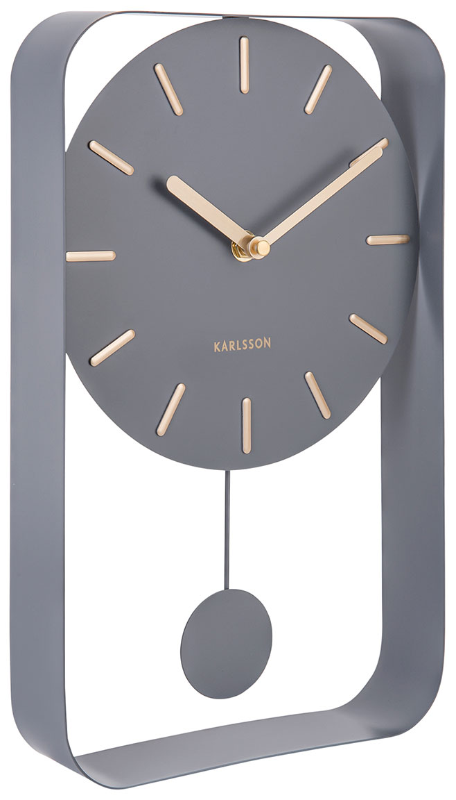 Karlsson Pendulum Charm Small KA5796GY harmaa seinäkello 20 cm. Metallista valmistettu harmaa kello kultaisilla osoittimilla ja indekseillä. Kellon mitat ovat 20 x 32,5 x 5 cm (LxKxS). Kello toimii yhdellä AA-paristolla (paristo ei sisälly hintaan). Karlsson-kelloilla on kahden vuoden takuu.