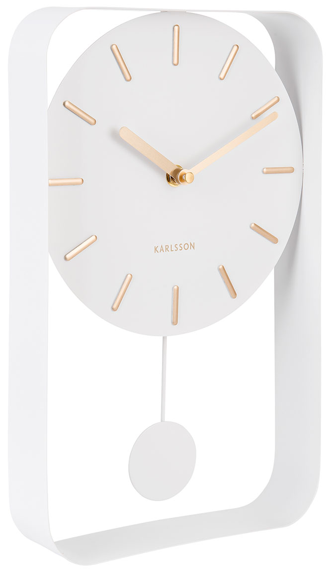 Karlsson Pendulum Charm Small KA5796WH valkoinen seinäkello 20 cm. Metallista valmistettu valkoinen kello kultaisilla osoittimilla ja indekseillä. Kellon mitat ovat 20 x 32,5 x 5 cm (LxKxS). Kello toimii yhdellä AA-paristolla (paristo ei sisälly hintaan). Karlsson-kelloilla on kahden vuoden takuu.