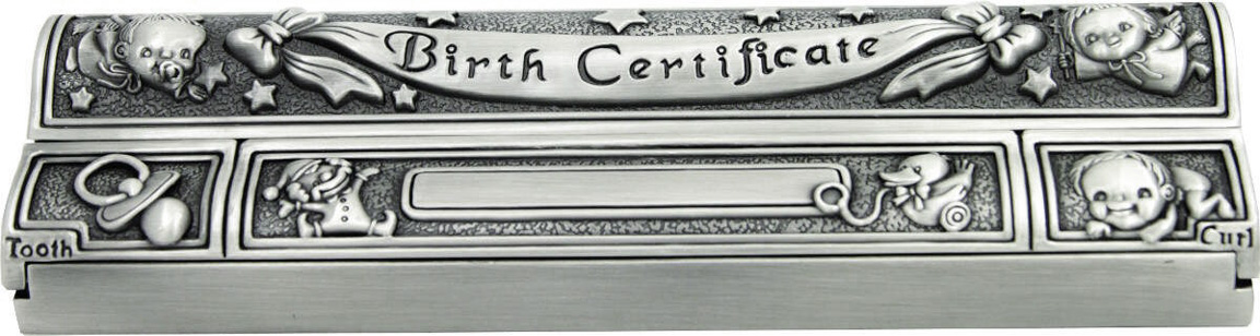 Materiaali: Tinalla pinnoitettu metalliseos Vuoraus: Sininen samettikangas Tekstit: Birth certificate, tooth & curl Pituus: 200 mm Leveys: 70 mm