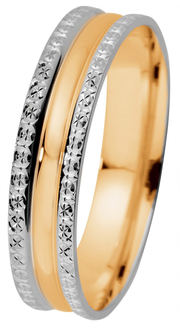 Kohinoor 013-930 Essi on kaunis korusormus, jossa yhdistyy kelta- ja valkokulta, ja valkokultareunaa koristaa kaunis ornamettikuvio. Rungon leveys on 4,5 mm.