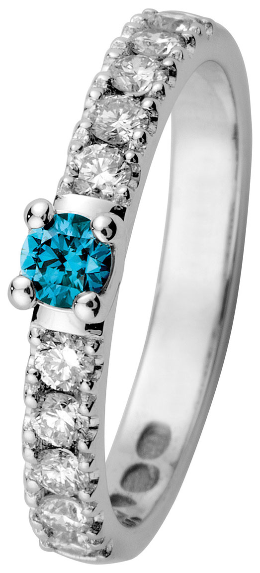 14 Karaatin valkokullasta valmistettu erittäin näyttävä sormus. 8 säihkyvää timanttia koristaa edustaa ja keskellä 1 timantti on suurempi ja kauniin sininen. Halkaisija on valintasi mukaan 16-18,5mm. Tämä näyttävä sormus on Kohinoorin kihlamallistosta tuttu, joten se sopii todella hyvin niin kihla- kuin vihkisormukseksi. Sormus on leveydeltään 2,4mm.