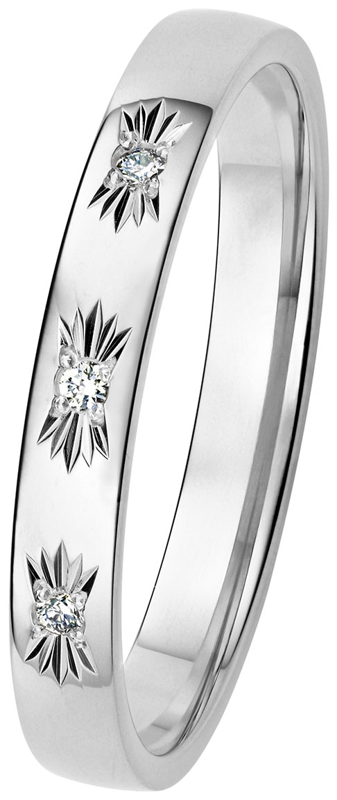 Kohinoor Kosketus 033-470V-04 on kaunis 14k valkokullasta valmistettu rivitimanttisormus. Rivisormuksessa on 3 x 0,015 ct timanttia. Timanttien yhteispaino on siis 0,045 ct. Sormuksen leveys on 3 mm. Kohinoor sormukset toimitetaan valmistajan alkuperäisessä rasiassa ja niille myönnetään vuoden takuu.