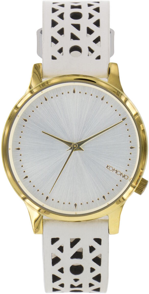 Naisten Komono Estelle Cutout White Gold W2652 rannekellossa on kuvioitu valkoinen aito nahkaranneke. Rannekkeen leveys kiinnityskohdasta on 16 mm. Rannekellon rungon leveys on 36 mm ja paksuus 8 mm. Komono-kellojen koneistoille myönnetään valmistajan virallinen yhden vuoden takuu. Valmistajan takuu ei korvaa kellon rungon ja rannekkeen kulumista käytössä. Komono-rannekellot toimitetaan valmistajan alkuperäisessä rasiassa.