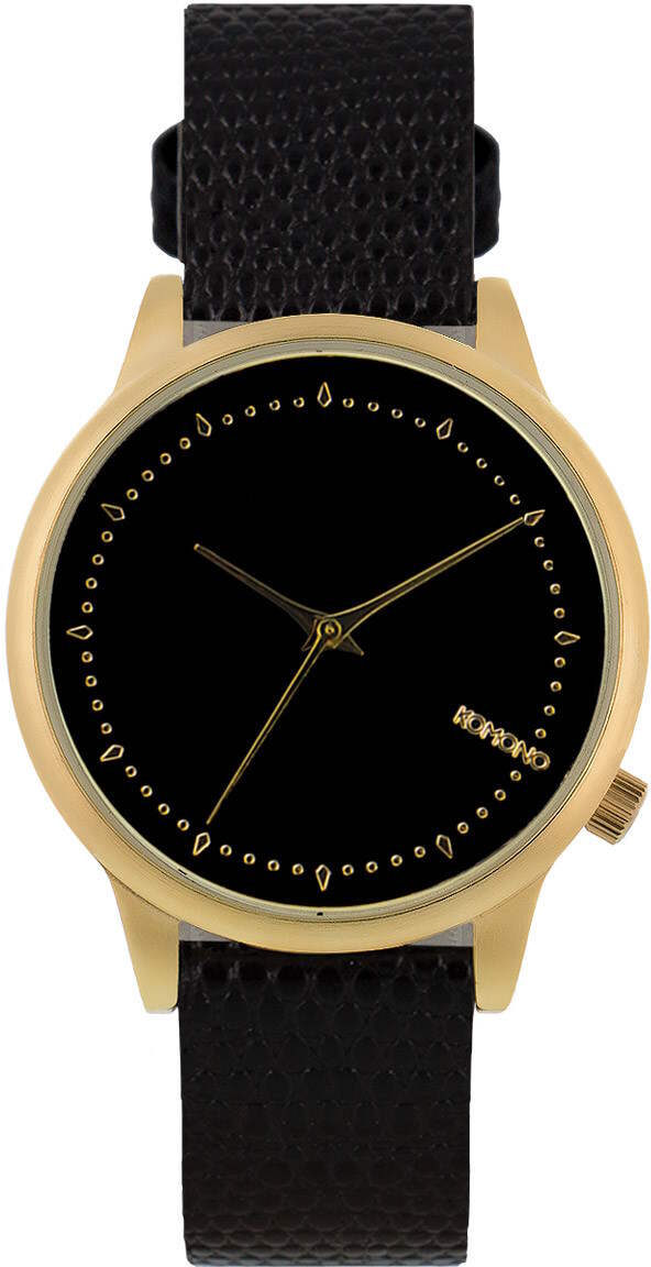 Komono Estelle Monte Carlo Lizard W2703 mallissa on kullanvärinen runko ja musta kellotaulu. Rannekkeen leveys kiinnityskohdasta on 16 mm. Kellon rungon leveys on 36 mm ja paksuus 8 mm. Komono-kellojen koneistoille myönnetään valmistajan virallinen yhden vuoden takuu. Valmistajan takuu ei korvaa kellon rungon ja rannekkeen kulumista käytössä. Komono-rannekellot toimitetaan valmistajan alkuperäisessä rasiassa.