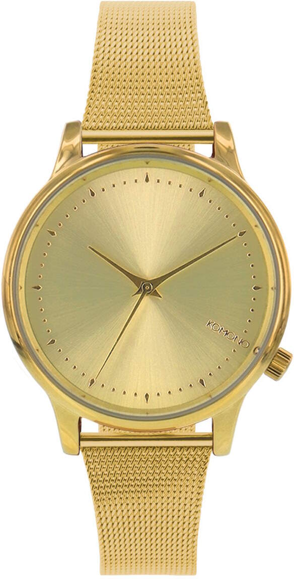 Komono Estelle Royale Gold W2861, rannekello on kaunis, keltakullan värinen kokonaisuus. Rannekeen leveys kiinnityskohdasta on 16 mm. Rungon leveys on 36 mm ja paksuus 8 mm. Komono-kellojen koneistoille myönnetään valmistajan virallinen yhden vuoden takuu. Valmistajan takuu ei korvaa kellon rungon ja rannekkeen kulumista käytössä. Komono-rannekellot toimitetaan valmistajan alkuperäisessä rasiassa.