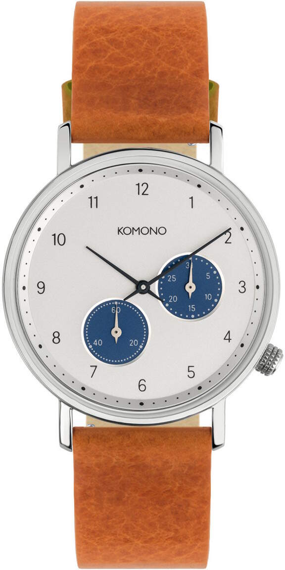 Komono Walther Camel W4000 miesten rannekello on tyylikäs kevään 2017 uutuus. Rannekellossa ominaisuutena päivyri ja sen vesitiiviysluokitus on 10ATM/100m. Lisäksi kellon mineraalilasissa on safiiripinnoite. Ruskean rannekkeen leveys kiinnityskohdasta on 20mm ja hopean rungon leveys 40mm. Komono-kellojen koneistoille myönnetään valmistajan virallinen yhden vuoden takuu. Valmistajan takuu ei korvaa kellon rungon ja rannekkeen kulumista käytössä. Komono-rannekellot toimitetaan valmistajan alkuperäisessä rasiassa.