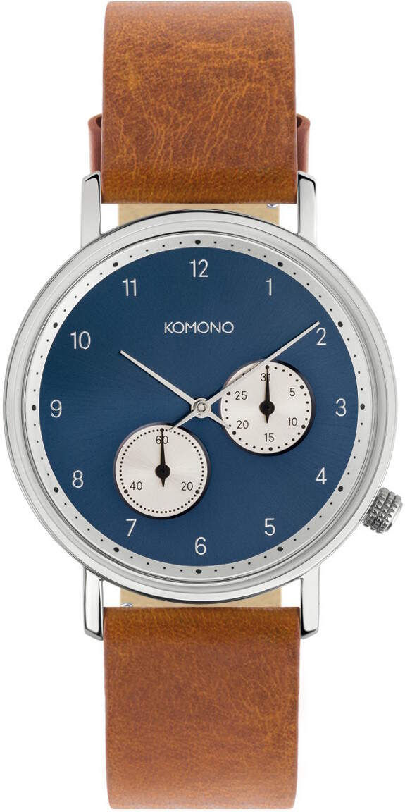Komono Walther Cognac W4001 miesten rannekellossa upea syvänsininen kellotaulu. Rannekellossa ominaisuutena päivyri ja sen vesitiiviysluokitus on 10ATM/100m. Lisäksi kellon mineraalilasissa on safiiripinnoite. Ruskean rannekkeen leveys kiinnityskohdasta on 20mm ja hopean rungon leveys 40mm. Komono-kellojen koneistoille myönnetään valmistajan virallinen yhden vuoden takuu. Valmistajan takuu ei korvaa kellon rungon ja rannekkeen kulumista käytössä. Komono-rannekellot toimitetaan valmistajan alkuperäisessä rasiassa.