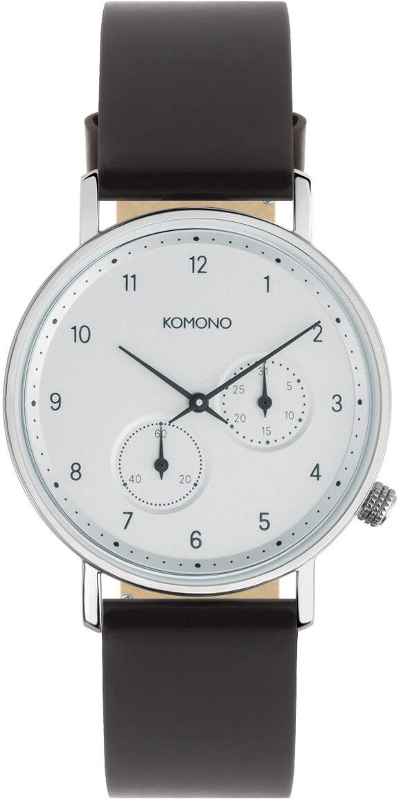 Komono Walther Nero W4002 miesten rannekello on tyylikäs kevään 2017 uutuus. Musta ja hopea ovat aina erehtymätön yhdistelmä! Rannekellossa ominaisuutena päivyri ja sen vesitiiviysluokitus on 10ATM/100m. Lisäksi kellon mineraalilasissa on safiiripinnoite. Mustan rannekkeen leveys kiinnityskohdasta on 20mm ja hopean rungon leveys 40mm. Komono-kellojen koneistoille myönnetään valmistajan virallinen yhden vuoden takuu. Valmistajan takuu ei korvaa kellon rungon ja rannekkeen kulumista käytössä. Komono-rannekellot toimitetaan valmistajan alkuperäisessä rasiassa.