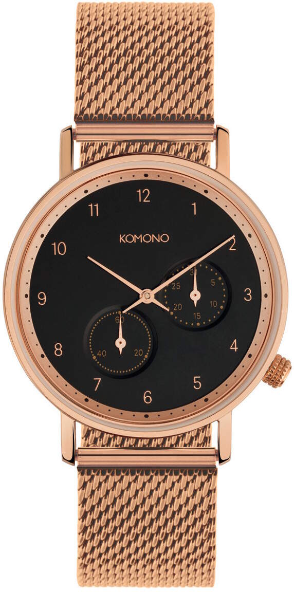 Komono Walther Rose Gold W4022 rannekellossa on mesh-ranneke, joka lisää kellon ulkonäköön tyylikkyyttä. Rannekellossa ominaisuutena päivyri ja sen vesitiiviysluokitus on 10ATM/100m. Lisäksi kellon mineraalilasissa on safiiripinnoite. Punakultaisen mesh-rannekkeen leveys kiinnityskohdasta on 20mm ja rungon leveys 40mm. Komono-kellojen koneistoille myönnetään valmistajan virallinen yhden vuoden takuu. Valmistajan takuu ei korvaa kellon rungon ja rannekkeen kulumista käytössä. Komono-rannekellot toimitetaan valmistajan alkuperäisessä rasiassa.
