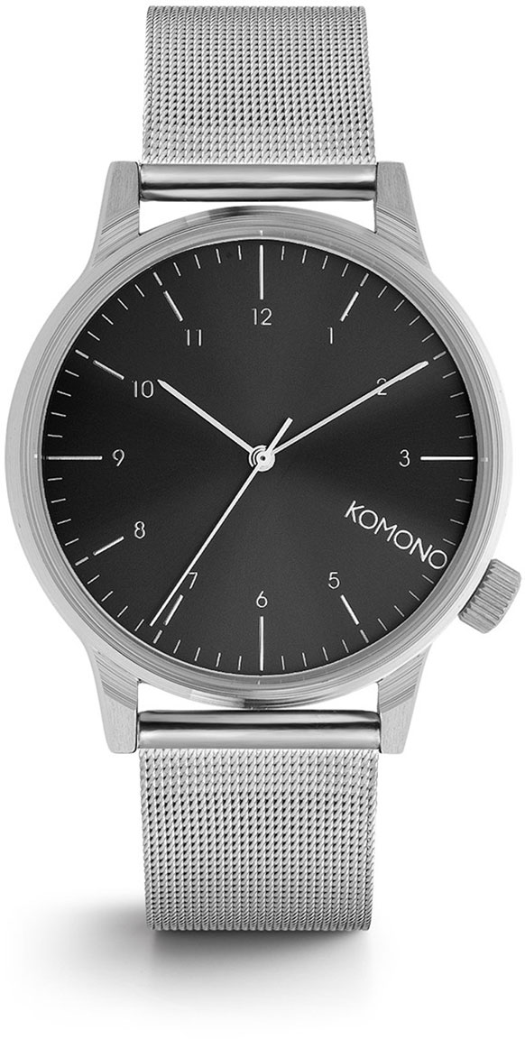 Komono Winston Royale Silver/Black W2357 miesten rannekello mesh-rannekkeella. Rannekkeen leveys kiinnityskohdasta on 20mm ja hopean rungon leveys 42mm. Kellotaulussa on erittäin tyylikäs tumma väritys ja selkeät hopean väriset numerot. Komono-kellojen koneistoille myönnetään valmistajan virallinen yhden vuoden takuu. Valmistajan takuu ei korvaa kellon rungon ja rannekkeen kulumista käytössä. Komono-rannekellot toimitetaan valmistajan alkuperäisessä rasiassa.