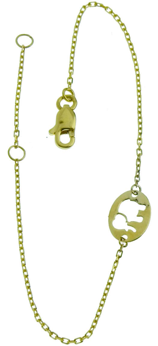 Suloinen lasten rannekoru on valmistettu kokonaisuudessaan 14 karaatin kullasta. Korussa on siro 0,9mm leveä ankkuriketju ja koruosana pyöreä laatta, jossa on norsun muotoinen aukko. Ranneketju on säädettävissä 14 tai 16cm pituuteen. Ketjun paino on noin 0,8 g.