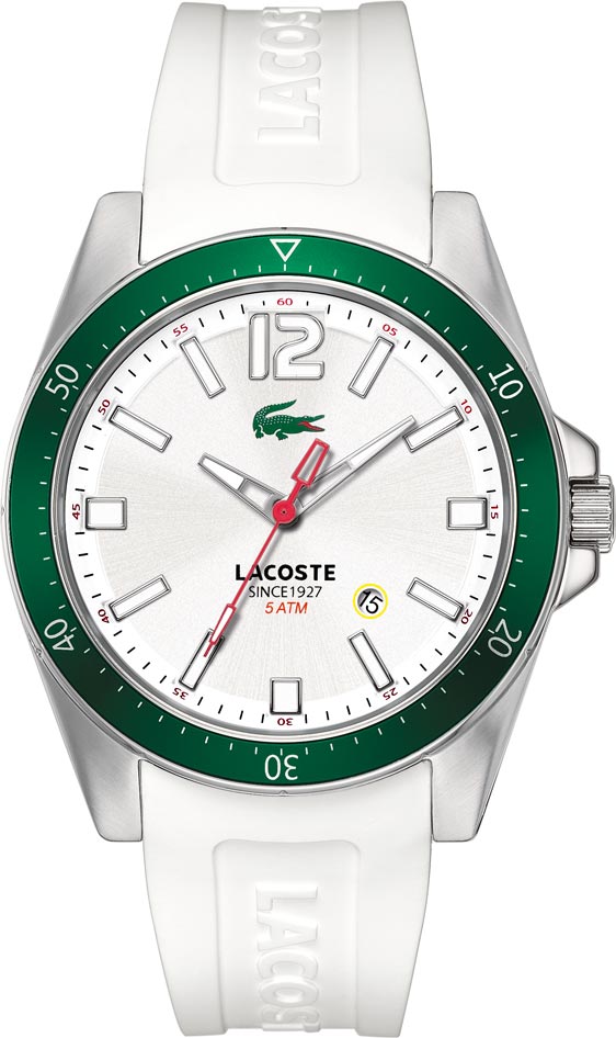 Lacoste 2010664 Seattle kellossa on hieno vihreä kellotaulun kehä ja valkoinen silikoniranneke. Rungon leveys on 43mm ja paksuus 13mm. Rannekkeen leveys kiinnityskohdasta 22mm. Lacoste rannekellot toimitetaan valmistajan alkuperäisessä rasiassa ja niille myönnetään 2 vuoden takuu.