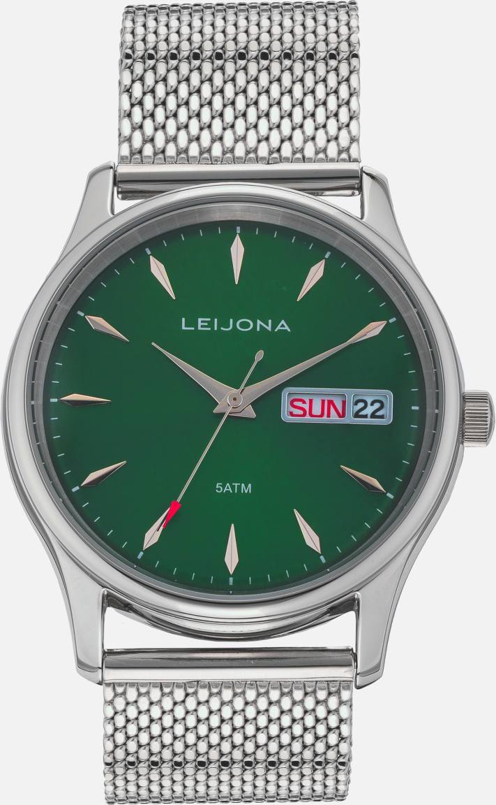 Leijona 5012-2213 -kellossa on käteen hyvin istuva mesh-ranneke, joka on helposti kotikonstein säädettävissä oikeaan mittaan. Tässä mallissa on vihreä kellotaulu ja kaksoispäivyri. Kellon runko on leveydeltään 41mm ja paksuudeltaan 11mm. Rannekkeen leveys kiinnityskohdasta on 22mm. Leijona kelloille myönnetään kahden vuoden takuu ja ne toimitetaan valmistajan alkuperäisessä rasiassa.