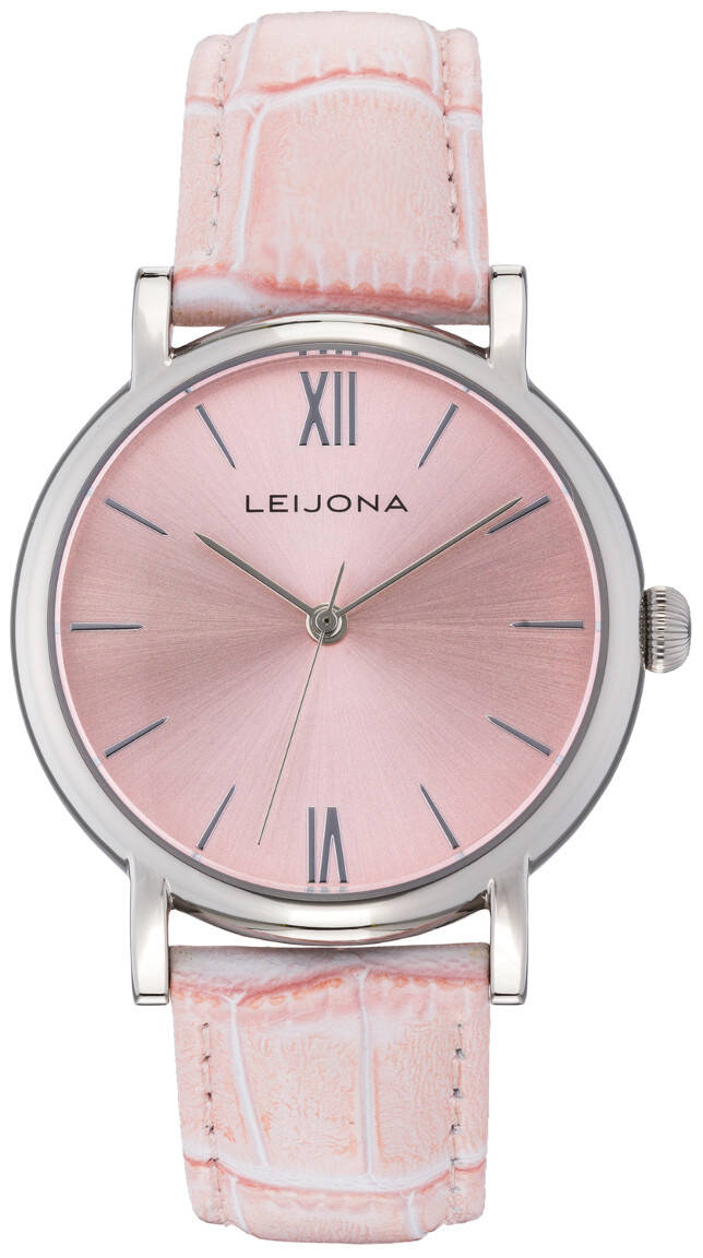 Leijona 5120-4294 -rannekello on sievän pinkki ajan näyttäjä. Kellon runko on valmistettu hopean värisestä ruostumattomasta teräksestä ja vaaleanpunainen krokotiilikuvioitu ranneke on aitoa nahkaa. Kellon rungon leveys on 35.8mm ja paksuus 8.6mm. Rannekkeen leveys kiinnityskohdassa on 18mm. Leijona -kelloille myönnetään 2 vuoden takuu ja ne toimitetaan valmistajan alkuperäisessä pakkauksessa. Voimme kaivertaa veloituksetta kellon takakanteen esimerkiksi nimikirjaimet ja päivämäärän (maksimissaan 20 merkkiä). Valitse ensin kaiverrus ja kaiverruksessa käytettävä tekstityyli, ja kirjoita kaiverrettavat tiedot "kaiverrettava teksti" -kenttään. Huomaathan, että kaiverretuilla tuotteilla ei ole palautusoikeutta!