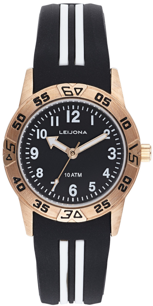 Kaksivärinen Leijona 5223-871-poikien rannekello sopii oivasti ensikelloksi perheen pienimmille. Kellossa on kestävä teräksinen ruusukullansävyinen ja solki, helposti luettavat numeroindeksit ja suuri musta taulu ja valossa luminoituvat pimeässä hohtavat osoittimet. Sekunnit ja minuutit on helppo lukea ja opetella kellon kullanvärisestä kehästä, jossa on vielä erillinen numerointi. Ranneke on valmistettu silikonista, jonka vuoksi se on kestävä ja miellyttävän pehmeä ranteessa, ja kestää kovaakin käyttöä. Ranneke on pituudeltaan 14-18,5 cm. Suomessa suunnitelluilla Leijona-kelloilla on kahden vuoden takuu, ja ne toimitetaan valmistajan alkuperäisessä rasiassa.