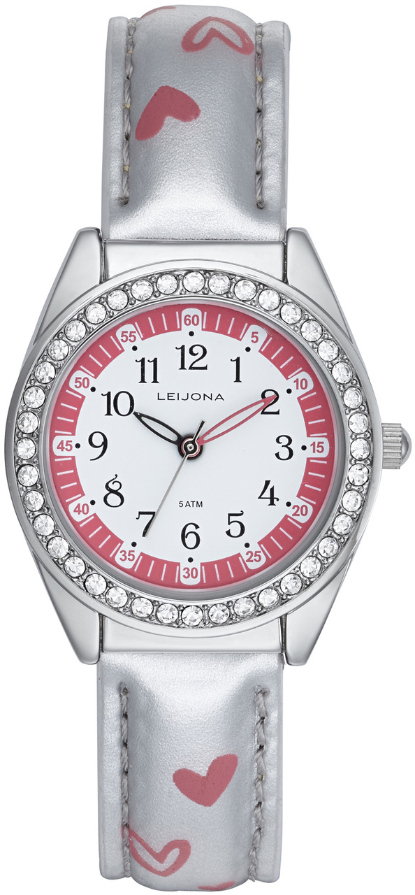 Hopeanpinkki Leijona 5323-967 lasten rannekello on koristeltu valloittavin sydämin ja kellokehään on upotettu kristalleja. Kellon ranneke on aitoa nahkaa ja tikattu reunoista, jonka vuoksi ranneke on kestävä. 28 mm leveä runko ruostumatonta terästä. Kaksiosaisesta kellotaulusta on helppo lukea sekä tunnit että minuutit, jonka vuoksi kello sopii hyvin ensikelloksi. Ranneke on pituudeltaan 14-17,5 cm. Koska kello kestää vettä 50 m saakka, ei pienet vesiroiskeetkaan haittaa Suomessa suunnitelluilla Leijona-kelloilla on kahden vuoden takuu, ja ne toimitetaan valmistajan alkuperäisessä rasiassa.