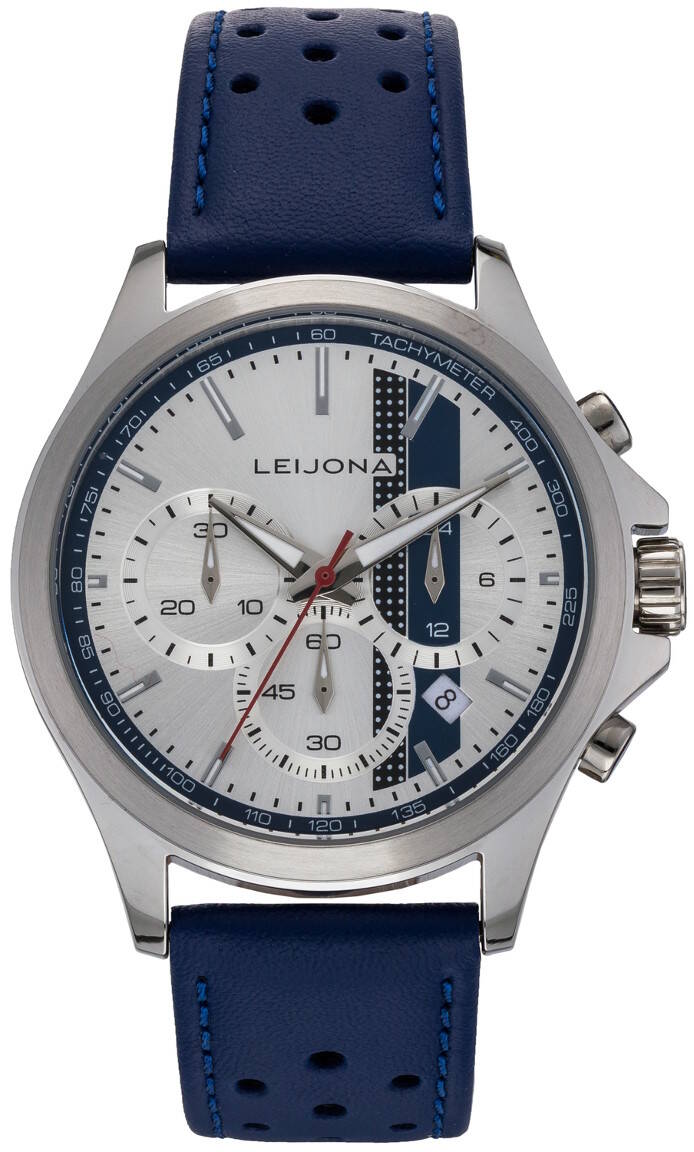 Leijona Chronograph 5020-2282 on tyylikäs autourheilu henkinen rannekello. Kellossa on sininen nahkaranneke, hopeanvärinen runko ja hopeanvärinen kellotaulu. Ominaisuuksina ajanotto sekä päivyri. Kellon rungon leveys on 40mm ja paksuus 10,2mm. Nahkarannekkeen leveys kiinnityskohdassa on 20mm. Leijona -kelloille myönnetään 2 vuoden takuu ja ne toimitetaan valmistajan alkuperäisessä pakkauksessa.