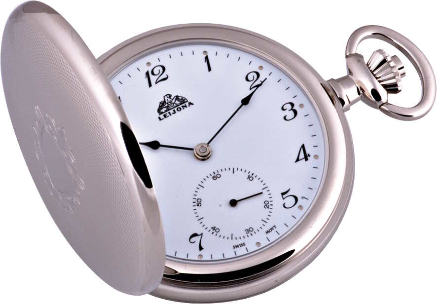 Leijona mekaaninen taskukello 5532-24. Kellon kuoressa on verkkokuvia ja etukannen keskellä vaakuna. Leijona kelloille myönnetään 2 vuoden takuu ja ne toimitetaan valmistajan alkuperäisessä rasiassa.