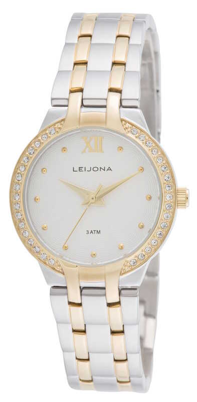 Naisten Leijona 5171-3838 rannekello. Kellon runko ja ranneke ovat valmistettu ruostumattomasta teräksestä ja väriltään ne ovat sekä hopeiset että kultaiset. Rungon leveys on 30mm ja paksuus 8mm. Rannekkeen leveys on 15mm. Kellon ulkokehälle on upotettu zirkonia -korukiviä. Leijona kellolle myönnetään kahden vuoden takuu ja tuote toimitetaan valmistajan alkuperäisessä rasiassa.