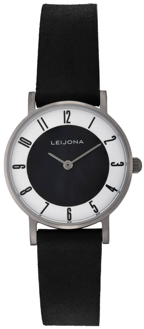 Leijona 5188-1681 -rannekellolla on siro design mutta vahva toteutus! Tumma osa kellon kellotaulussa on kauniisti helmeilevää helmiäistä. Kellon runko on valmistettu harmaan värisestä titaanista ja musta ranneke on aitoa nahkaa. Kellon rungon leveys on 27.9mm ja paksuus 7mm. Rannekkeen leveys kiinnityskohdassa on 14mm. Leijona -kelloille myönnetään 2 vuoden takuu ja ne toimitetaan valmistajan alkuperäisessä pakkauksessa. Voimme kaivertaa veloituksetta kellon takakanteen esimerkiksi nimikirjaimet ja päivämäärän (maksimissaan 10 merkkiä). Valitse ensin kaiverrus ja kaiverruksessa käytettävä tekstityyli, ja kirjoita kaiverrettavat tiedot "kaiverrettava teksti" -kenttään. Huomaathan että kaiverretuilla tuotteilla ei ole palautusoikeutta!