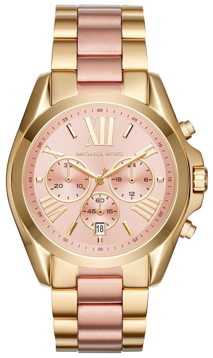 Michael Kors Bradshaw MK6359 Chronograph on näyttävä kullan- ja punakullanvärinen kello. Ominaisuutena ajanotto sekä päivyri. Kellon runko on leveydeltään 43mm ja paksuus 13mm. Rannekkeen leveys kiinnityskohdasta on 22mm. Laadukkaille Michael Kors kelloille myönnetään kahden vuoden takuu ja ne toimitetaan valmistajan alkuperäisessä rasiassa.