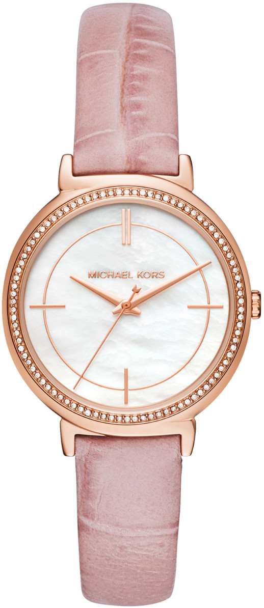 Kaunis kivikoristelu antaa luksusilmeen Michael Kors Cinthia MK2663-rannekellolle. Kellossa on 33 mm:n levyinen kapea runko, josta on vaaleanpunahohtoinen helmiäistaulu yhdistettynä ruusukullansävyisiin osoittimiin. Krokotiilikuvioitu vaalean roosan sävyinen pehmeä nahkaranneke viimeistelee upean ilmeen. Rannekkeen kiinnityskohdan leveys on 14 mm:iä. Michael Kors-kellot toimitetaan valmistajan alkuperäisessä pakkauksessa, ja niillä on 2 vuoden takuu.