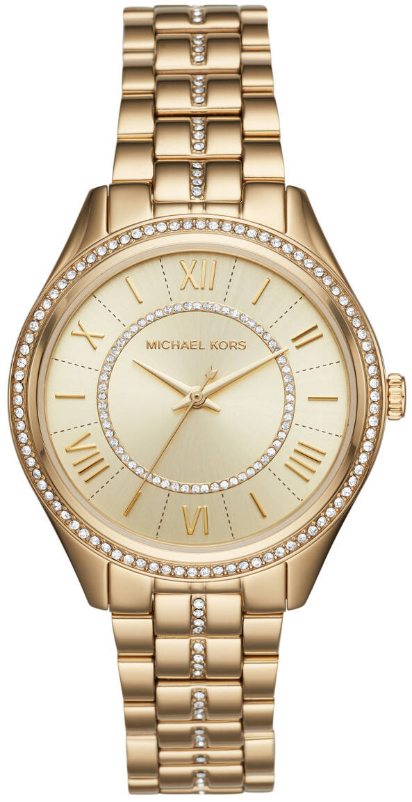 Michael Kors MK3718 Lauryn -kello yhdistää kristallisen designin ja käärii sen kultaiseen loistoon. Kellosta uniikin tekee kellotauluun ja rannekkeeseen upotetut kristallit ja tämä antaa sille silmiä hellivän lookin. Kellon runko ja ranneke on valmistettu kullanvärisestä ruostumattomasta teräksestä. Kellon rungon leveys on 38mm ja paksuus 8.4mm. Rannekkeen leveys kiinnityskohdasta on 17.8mm. Michael Kors -kelloille myönnetään 2 vuoden takuu ja ne toimitetaan valmistajan alkuperäisessä rasiassa. Voimme kaivertaa veloituksetta kellon takakanteen esimerkiksi nimikirjaimet ja päivämäärän (maksimissaan 20 merkkiä). Valitse ensin kaiverrus ja kaiverruksessa käytettävä tekstityyli ja kirjoita kaiverrettavat tiedot "kaiverrettava teksti" -kenttään. Huom! Kaiverretuilla tuotteilla ei ole palautusoikeutta!