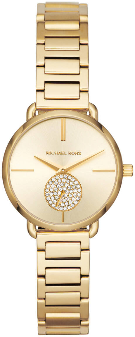 Michael Kors Portia MK3838 -rannekello on siro ja sievä ajan näyttäjä. Kellon runko ja turvalukollinen ranneke ovat valmistettu kullan väriseksi pinnoitetusta ruostumattomasta teräksestä. Ominaisuutena kellosta löytyy myös erillinen sekuntiosoitin. Kellon rungon leveys on 28mm ja paksuus 7mm. Rannekkeen leveys kiinnityskohdasta on 12mm. Michael Kors kelloille myönnetään kahden vuoden takuu ja ne toimitetaan valmistajan alkuperäisessä pakkauksessa. Voimme kaivertaa veloituksetta kellon takakanteen esimerkiksi nimikirjaimet ja päivämäärän (maksimissaan 15 merkkiä). Valitse ensin kaiverrus ja kaiverruksessa käytettävä tekstityyli ja kirjoita kaiverrettavat tiedot "kaiverrettava teksti" -kenttään. Huom! Kaiverretuilla tuotteilla ei ole palautusoikeutta!
