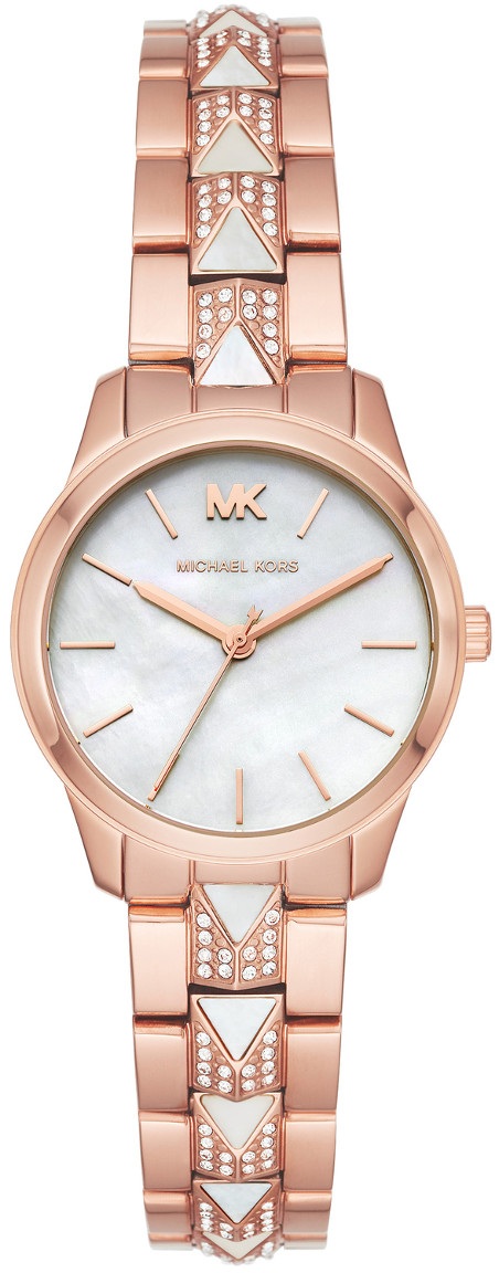 Michael Kors Runway Mercer MK6674 on suunnattoman kaunis naisten kello, jonka rannekkeesta kohoaa näyttäviä pikku "pyramideja". Kellotaulu ja kohoumien kyljet hurmaavat helmiäispintaisella viimeistelyllään. Muilta osin kello on valmistettu punakullan värisestä ruostumattomasta teräksestä. Rannekkeessa säkenöi lisäksi kirkkaita zirkoniakiviä. Tässä mallissa rungon halkaisija on 28 mm ja rannekkeen leveys kiinnityskohdasta 14 mm.