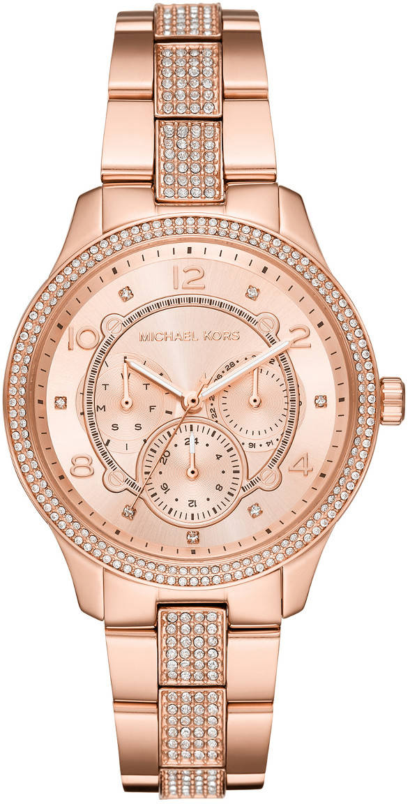 Michael Kors Runway MK6614 -rannekello on tyyliltään mainio asuste jokaiseen vuodenaikaan. Varsinkin talven pimeinä kuukausina kello on omimmillaan luminoituvien viisariensa ansiosta. Kellonajan lisäksi tämä malli kertoo näppärästi myös päivämäärän ja viikonpäivän. Punakullan värinen Michael Kors Runway on valmistettu ruostumattomasta teräksestä ja koristeltu kirkkain Swarovski-kristallein. Kellon rungolla on leveyttä 38 mm, rannekkeella puolestaan 18 mm. Tutustu myös malliston muihin upeisiin värivaihtoehtoihin!